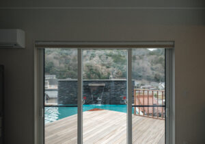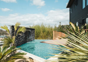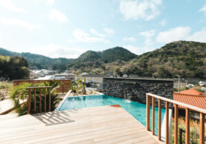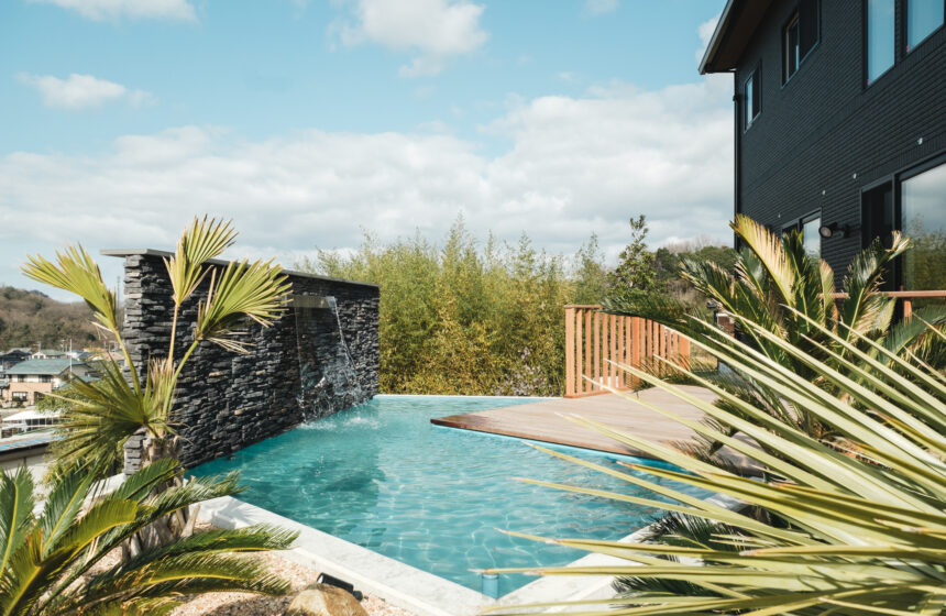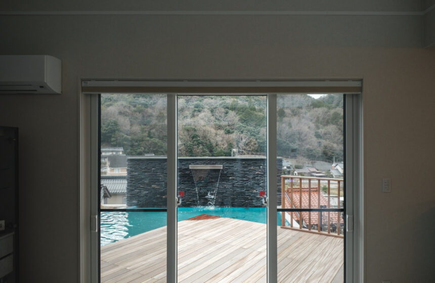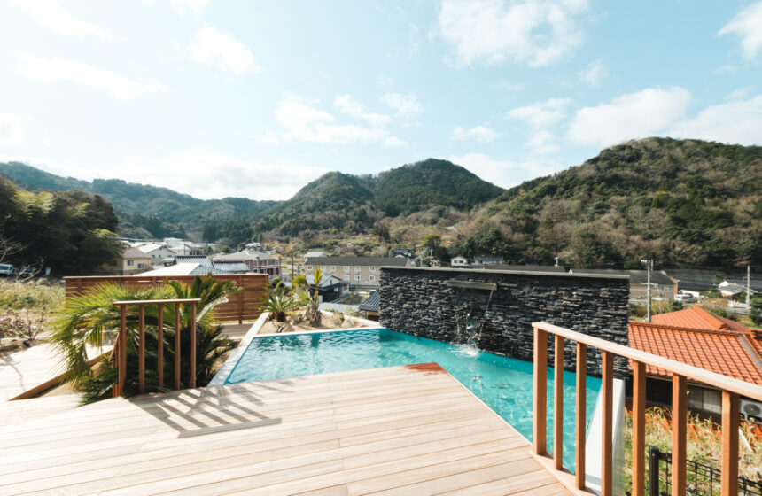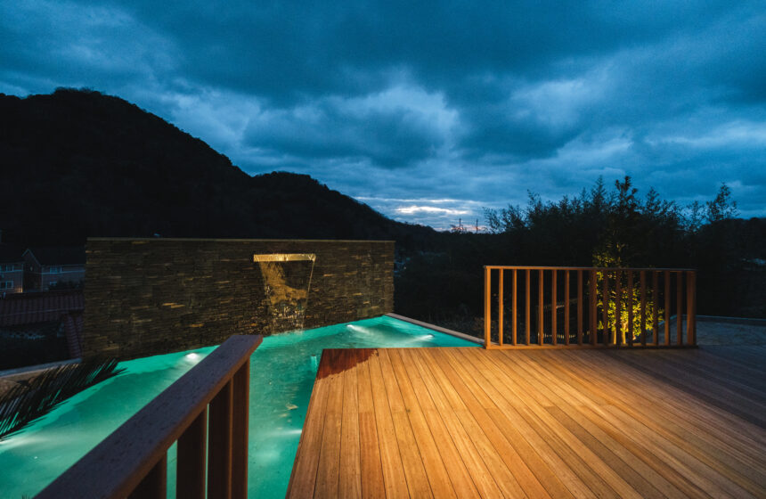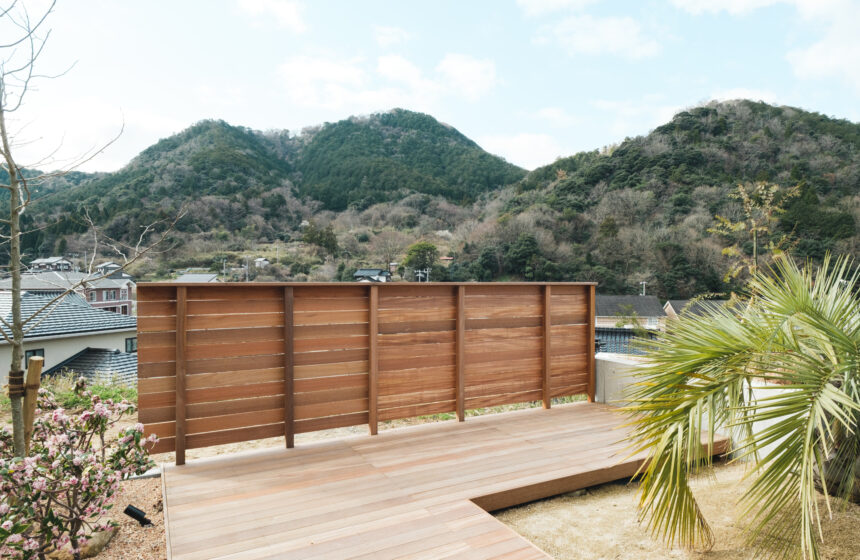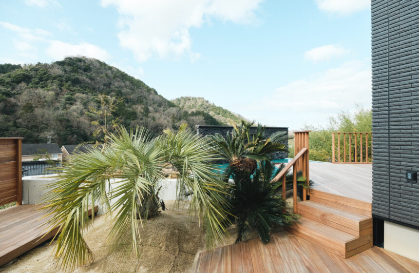 高台に佇む邸宅の、広大なウッドデッキと水盤
